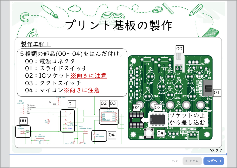 学習の過程では、抵抗・トランジスタ・マイコンなどの電子部品の役割を理解し、さらに回路図をもとに電子基板を実際に組み立てます。