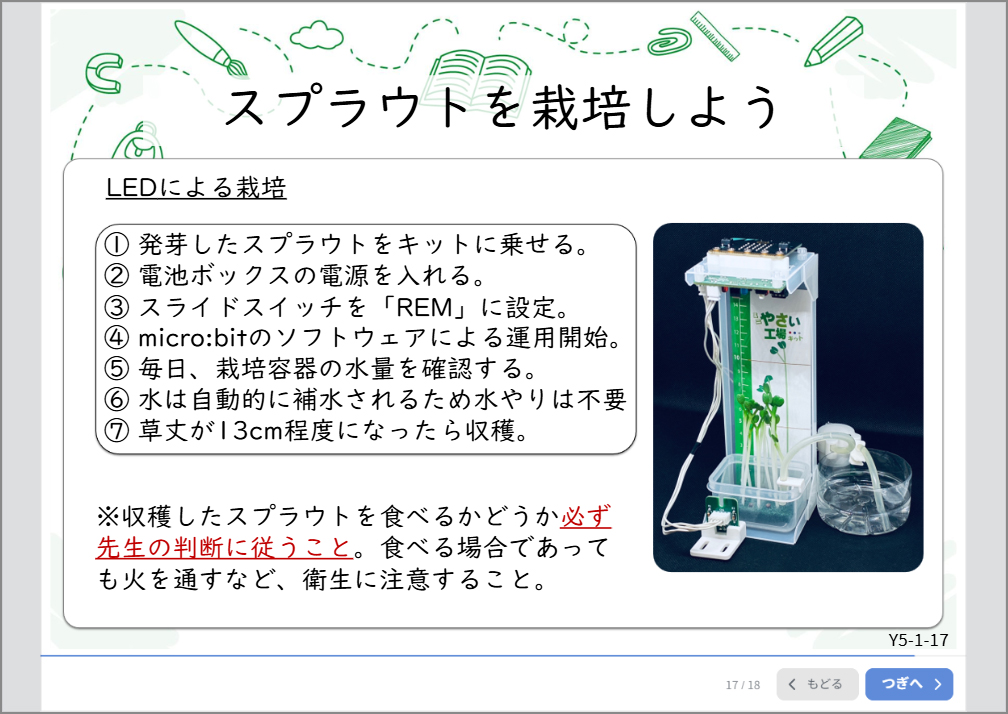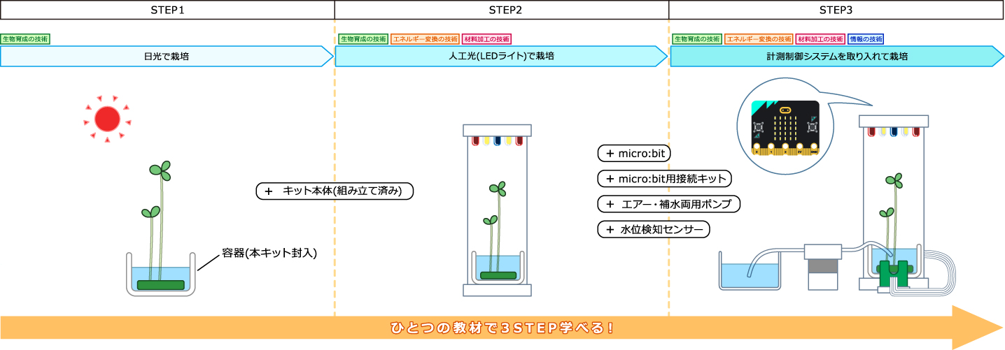 光の色による成長速度の違いなどを観察しながら育成することができるため、生物育成の基礎を学びながら、未来の野菜工場を想定して学ぶことができます。